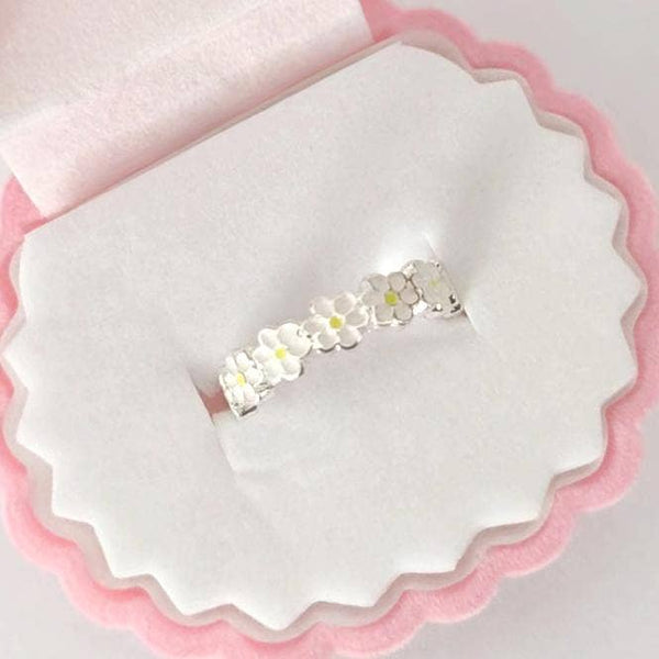 Wear a bouquet of flowers on your finger with the glorious Daisy Chain Ring. An entire band full of beautiful white flowers, daisies are the quiet beauty found in the simple and small things around us.